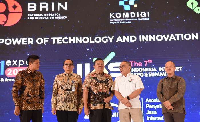 2025年印尼互联网博览会暨峰会是2025年印尼技术与创新博览会的系列活动之一。此次活动汇聚了来自国内外的众多企业、研究机构、协会至科技初创企业,共同展示印尼数字化转型的潜力与未来方向。图为周二(10月28日),国家研究与创新局长Laksana Tri Handoko(右二)、通信与信息技术部数字生态系统总司长Edwin Hidayat Abdullah(中)、印尼互联网服务提供商协会(APJII)总主席Muhammad Arif(左)、工业部工业4.0转型加速领域专家参谋Andi Rizaldi(左二),和CNG Trade Events总监Hendri Bunardy(右),在雅加达马腰兰国际会展中心(JIExpo Kemayoran)为2025年印尼互联网博览会暨峰会主持开幕式。(lcm)