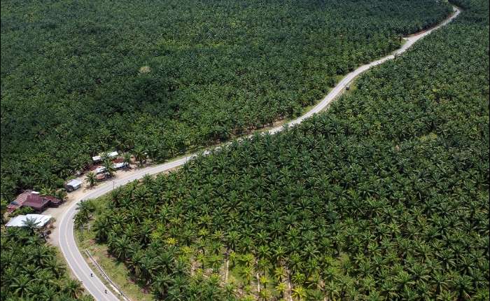 2025 年 10 月 29 日,航拍画面显示车辆行驶在西苏拉威西省中马穆朱县一处棕榈油种植园区域。