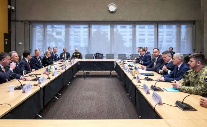 美乌代表团星期天(11月23日)在瑞士日内瓦磋商结束持续近四年的俄乌战争。美方团队包括国务卿鲁比奥(左三)和总统特使威特科夫(左二);乌方代表团团长是总统幕僚长叶尔马克(右四)。(法新社)