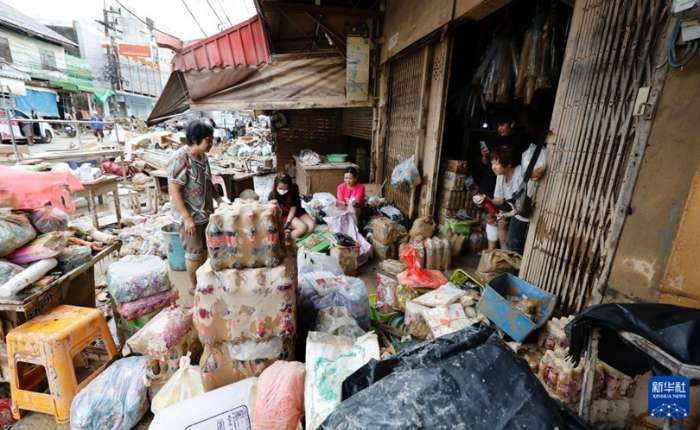 11月28日,在泰国宋卡府合艾市街头,当地居民在一家店铺整理沾染污泥的商品。