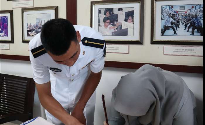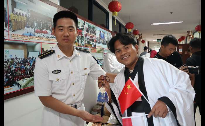 课堂结束后,现场举行了温馨的互赠礼物环节,双方互赠了精心准备的礼品。此举寓意深远,既饱含着对郑和舰此后航行一帆风顺、平安顺遂的美好祝愿,也寄托了对孔子学院事业蒸蒸日上、红红火火的殷切期许,更承载着希望中印尼两国友谊历久弥坚、长存不息的深厚情谊,让现场的友好氛围愈发浓厚。