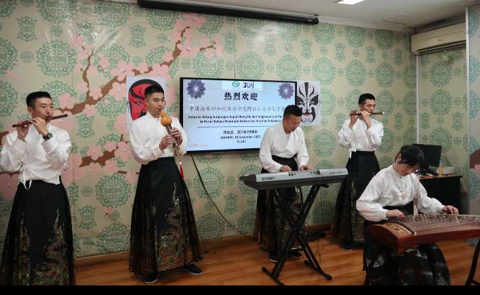 致辞结束后,精彩的文化演出轮番上演。阿拉扎大学孔子学院中文系学生身着汉服,深情演唱歌曲《明天会更好》。悠扬的旋律、真挚的歌声传递出对两国友好未来的美好憧憬,赢得现场阵阵雷鸣般的掌声。紧接着,郑和舰官兵代表带来了刚柔并济的太极表演,一招一式尽显中华武术的博大精深,让现场师生近距离感受中国传统文化的魅力;随后,民乐演奏《军港之夜》缓缓响起,悠扬的旋律不仅勾勒出军港的宁静与温馨,尽显中国民乐的独特韵味,更让印尼学子直观领略到中国军人文武双全的风采。