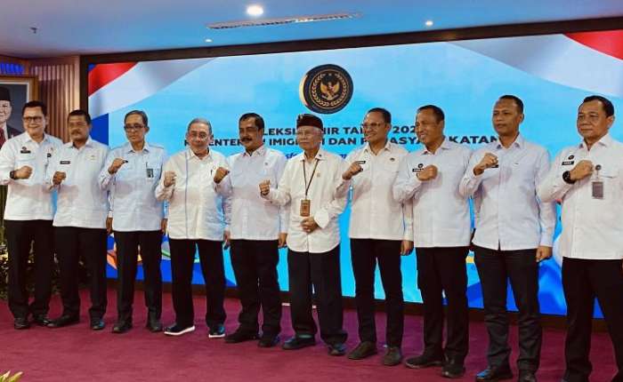 2025年12月29日,在雅加达移民与监狱事务部举行的2025年终总结活动结束后,阿古斯部长(左五)与部门领导层合影。