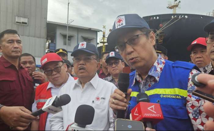 周五(2026年1月2日),卫生部长布迪.古纳迪.萨迪金(右一),和印尼红十字会主席尤素夫.卡拉(左三)陪同下,在雅加达向记者发表声明。