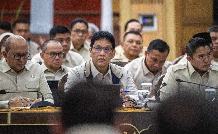 内阁秘书Teddy Indra Wijaya(右)与财政部长Purbaya Yudhi Sadewa(中)及投资与下游产业部长兼投资协调委员会(BKPM)主任兼达南塔拉投资管理机构首席执行官Rosan Roeslani(左),于2026年1月6日在西爪哇省茂物县汉巴朗出席红白内阁年度务虚会时,聆听总统普拉博沃•苏比安托在年初政策说明会上的指示。