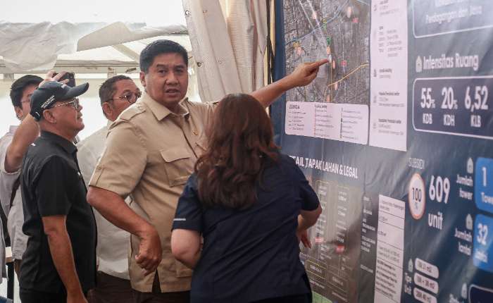 周三(1月21日),印尼住房和安置区部长马鲁阿拉尔.西拉伊特(Maruarar Sirait,右二)视察雅加达克玛腰兰(Kemayoran)地区政府补贴廉租房建设规划用地时查看布局设计图。该地块面积达3750平方米,计划建设一栋32层楼的补贴廉租公寓楼,共提供609套住房单位,预计将于2026年2月底举行奠基仪式。