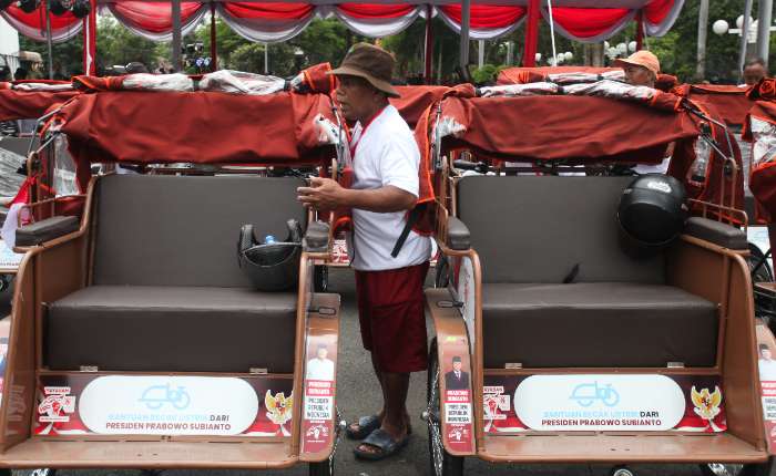 周四(1月22日),在东爪哇省泗水市政厅进行分发时,三轮车夫们正在查看电动三轮车。泗水市政府分发了由印尼总统普拉博沃.苏比安托通过国家团结运动基金会(Yayasan Gerakan Solidaritas Nasional)援助的200辆电动三轮车,这些三轮车将在泗水老城区(Kota Lama)及其他几个历史旅游区运营。