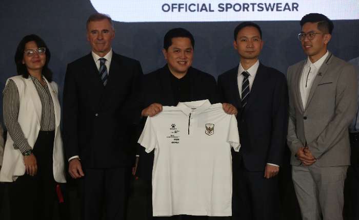 周五(1月23日),在雅加达举行的印尼国家队官方装备合作伙伴合作发布会上,印尼足球协会(PSSI)总主席埃里克.托希尔(Erick Thohir,中)与Kelme全球首席执行官克林顿(Clinten KE,右二)、PSSI第二副主席拉图.蒂莎.德斯特里亚(Ratu Tisha Destria,左)、Kelme全球副主席博尔哈.加西亚.涅托(Borja Garcia Nieto,左二)及Kelme印尼首席执行官凯文.维贾亚(Kevin Wijaya,右)共同展示Kelme Polo衫。印尼足球协会与Kelme签订了为期四年的合作协议。此后,所有印尼男足国家队、女足国家队、印尼室内足球国家队,以及裁判装备均将由Kelme品牌生产。