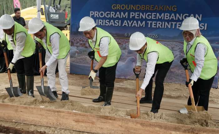 2026年2月6日,印尼农业部畜牧与动物卫生总局(Ditjen PKH)饲料司司长特里·梅拉萨里(右二),与印尼国有种植园公司 I(PTPN I)董事长泰迪·尤尼尔曼·达纳斯(右三)、楠榜省秘书长马林多·库尼亚万(中)、PTPN I楠榜第七区域负责人杜胡·班翁(左二)在楠榜南部共同为这一综合养鸡产业项目奠基。由普拉博沃总统发起的“自主蛋白与综合养鸡产业下游化”计划在多个省份同步实施。