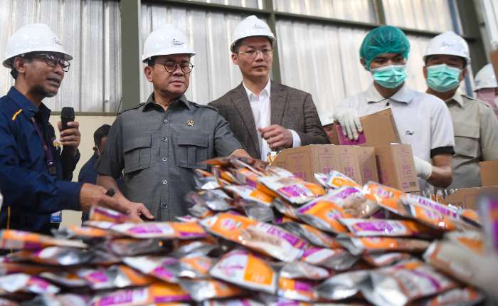 周四(2月12日),印尼贸易部长布迪.桑托索(左二)与Evo集团创始人亨德里(中)在南苏门答腊省巴纽阿辛Banyuasin县视察Evo Manufacturing Indonesia(EMI)公司工厂的宠物食品生产线。Evo Manufacturing Indonesia公司向菲律宾出口七吨宠物食品。