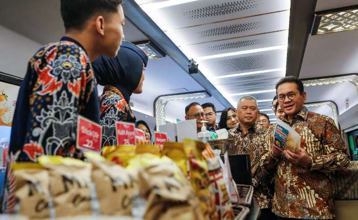 周二(2026年2月24日),贸易部长布迪.桑托索(右)与交通部长杜迪.普尔瓦甘迪(右二)在雅加达Gambir车站的阿尔戈.辛多罗号列车(KA Argo Sindoro)餐车内,视察本地中小微企业产品时,与工作人员交谈。贸易部与交通部合作,为本地中小微企业产品提供市场准入支持,使其能够在KAI服务的商业网络内销售,以提升本地产品的知名度。