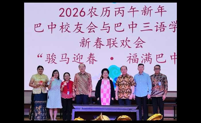 巴中校友会主席林凤英、永久名誉主席李世镰,副主席郑维克、林锋昇;巴中三语学校基金会辅导主席朱祖慰、监事长陈鹤昌,基金会主席廖世隆、执行主席凌香爱;来自香港的校友梁淦基夫妇,印尼知名学者王小明博士(Prof.Dr.Novi Basuki)等校方领导、校友会代表,与全体师生及家长,近千人共同出席活动。伴随着一对醒狮腾跃献瑞,新春联会正式拉开帷幕。