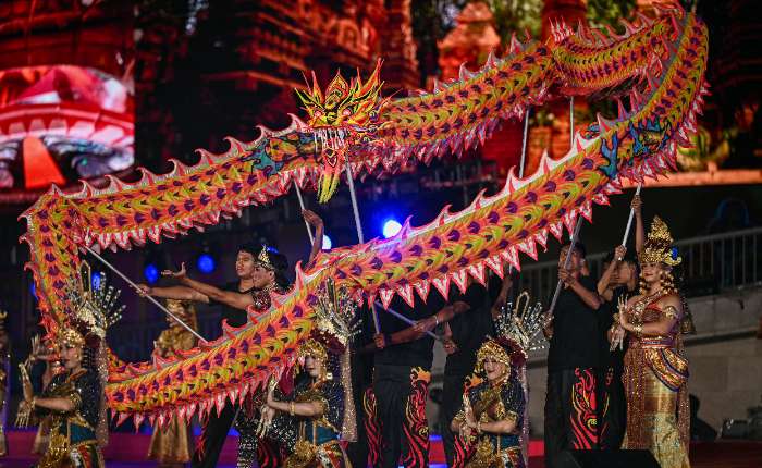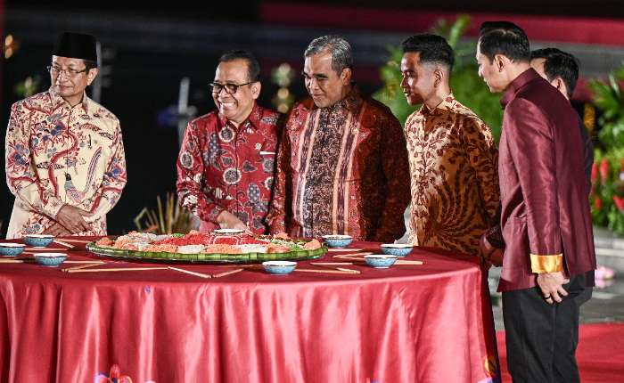 周六(2026年2月28日),副总统吉布兰(左二)、人民协商会议(MPR)主席艾哈迈德•穆扎尼(中)、人类发展与文化统筹部长普拉蒂克诺(左二)、基础设施与区域发展统筹部长阿古斯(右)及宗教部长纳萨鲁丁•奥马尔(左)在雅加达Lapangan Banteng广场公园出席2026年群岛春节庆典峰会。该活动为庆祝春节,同时展现华族与群岛文化在多元和谐中的交融,并成为加强兄弟情谊与团结的重要契机。