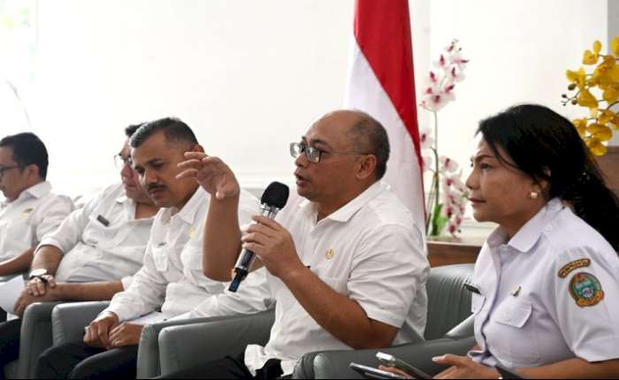 2026年3月4日,北苏门答腊省省投资与一站式服务局协调官达马尔(左四)在省长办公室新闻发布会上阐述北苏门答腊省投资实现情况。