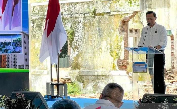 基础设施与区域发展统筹部长AHY在雅加达芒加莱火车站印尼铁路公司资产用地上举行的‘支持300万套住房计划的建设’启动仪式上致辞。