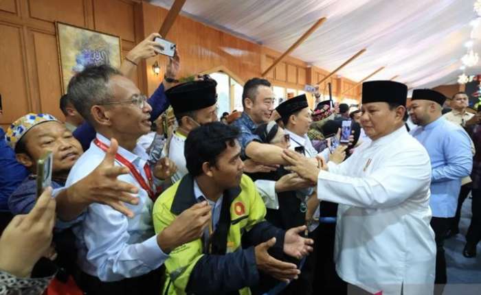 普拉博沃•苏比延托总统于3月21日在雅加达总统府举行的伊历1447年开斋节开放日活动中,向出席的众多民众致以问候并亲切握手。