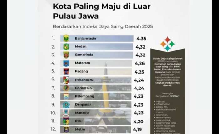 【本报讯】根据印尼国家研究与创新机构(BRIN)发布的2025年区域竞争力指数(IDSD),中加里曼丹省的帕朗卡拉亚(Palangka Raya)市位列爪哇岛以外最发达的13个城市之列。