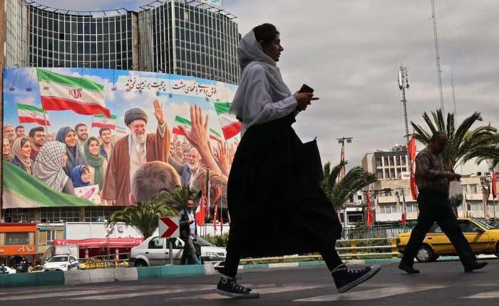 据伊朗媒体报道,伊朗尚未决定是否派团参加在巴基斯坦举行的第二轮美伊谈判。图为悬挂在德黑兰街头的已故伊朗最高领袖哈梅内伊的海报。(法新社)