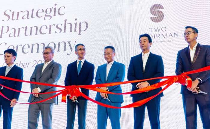 图为:PT Central Sudirman Development 总裁 Hendra Lubis(左二)与Danamon银行(PT Bank Danamon Indonesia Tbk)风险管理总监 Yasuaki Oda(左三)及其他董事于上周末在雅加达共同为 Two Sudirman 私人公寓项目剪彩,并宣布建立战略合作伙伴关系,旨在为潜在业主拓展融资渠道。此次合作聚焦于提供灵活的金融方案,便利民众置业。(商报/Hermawan摄)