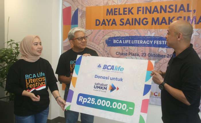 图为:10月23日(周四),在雅加达举行的中小微企业金融教育活动上,PT Asuransi Jiwa BCA(BCA Life)董事古纳万·普拉约戈(Gunawan Prayogo,中)在BCA Life营销传播主管莉莉·佩基(Lely Pekih,左)的陪同下,将捐款移交给Sahabat UMKM秘书长费萨尔·哈桑·巴斯里(Faisal Hasan Basri,右)。为纪念2025年金融包容月,BCA Life举办了面向中小微企业的金融教育活动。通过此次活动,公司希望帮助中小微企业更好地了解财务规划与保险保障的重要性,从而支持其实现可持续经营。(商报/Hermawan摄)