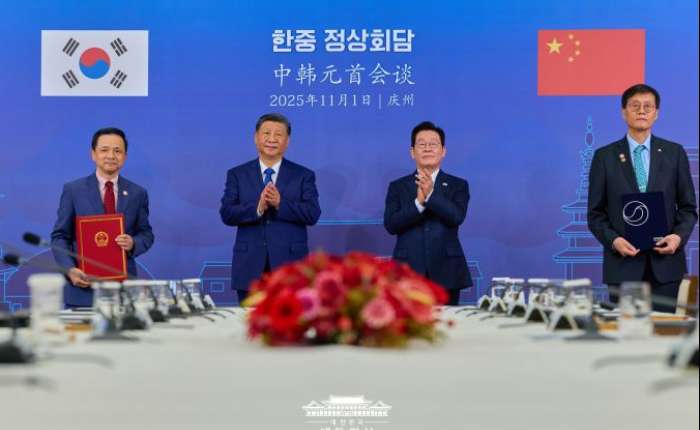 图为中国驻韩国大使戴兵(左起)、中国国家主席习近平、韩国总统李在明和韩国银行(央行)行长李昌镛1日在韩中首脑会谈后续签货币互换协议。(图片由韩国总统办公室提供)