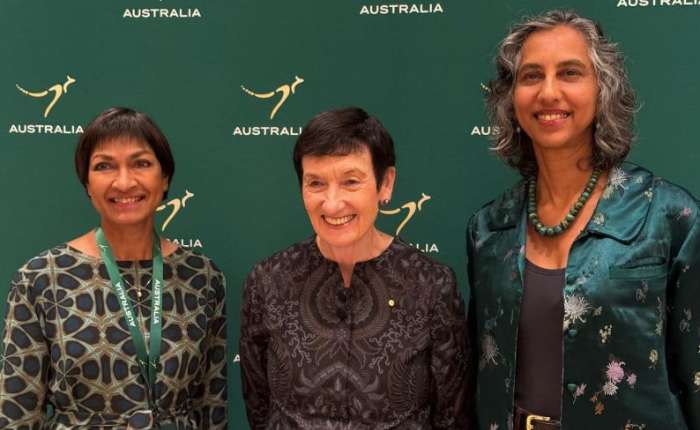 周一(11月10日),澳大利亚驻印尼副大使Gita Kamath(右)、澳大利亚对印尼事务商务特使Jennifer Westacott,和NFF首席执行官Su McCluskey,在雅加达出席第三届澳大利亚-东南亚商业交流活动合影留念。