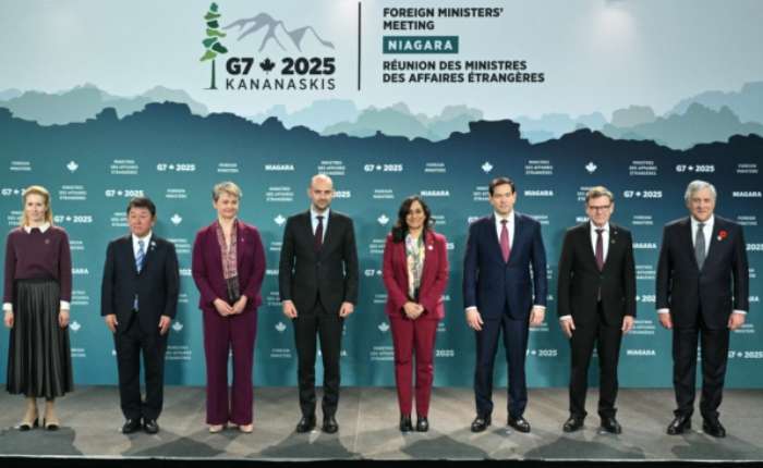 2025年11月11日,在加拿大安省尼亚加拉白橡树度假村,举行七国集团外长会议。从左至右:欧盟副主席卡娅·卡拉斯、日本外务大臣茂木敏充、英国外交大臣伊薇特·库珀、法国外长让-诺埃尔·巴罗、加拿大外长安妮塔·阿南德、美国国务卿马可·卢比奥欧、德国外长约翰·瓦德普尔以及意大利外长安东尼奥·塔贾尼。(美联社/Mandel Ngan/加通社)