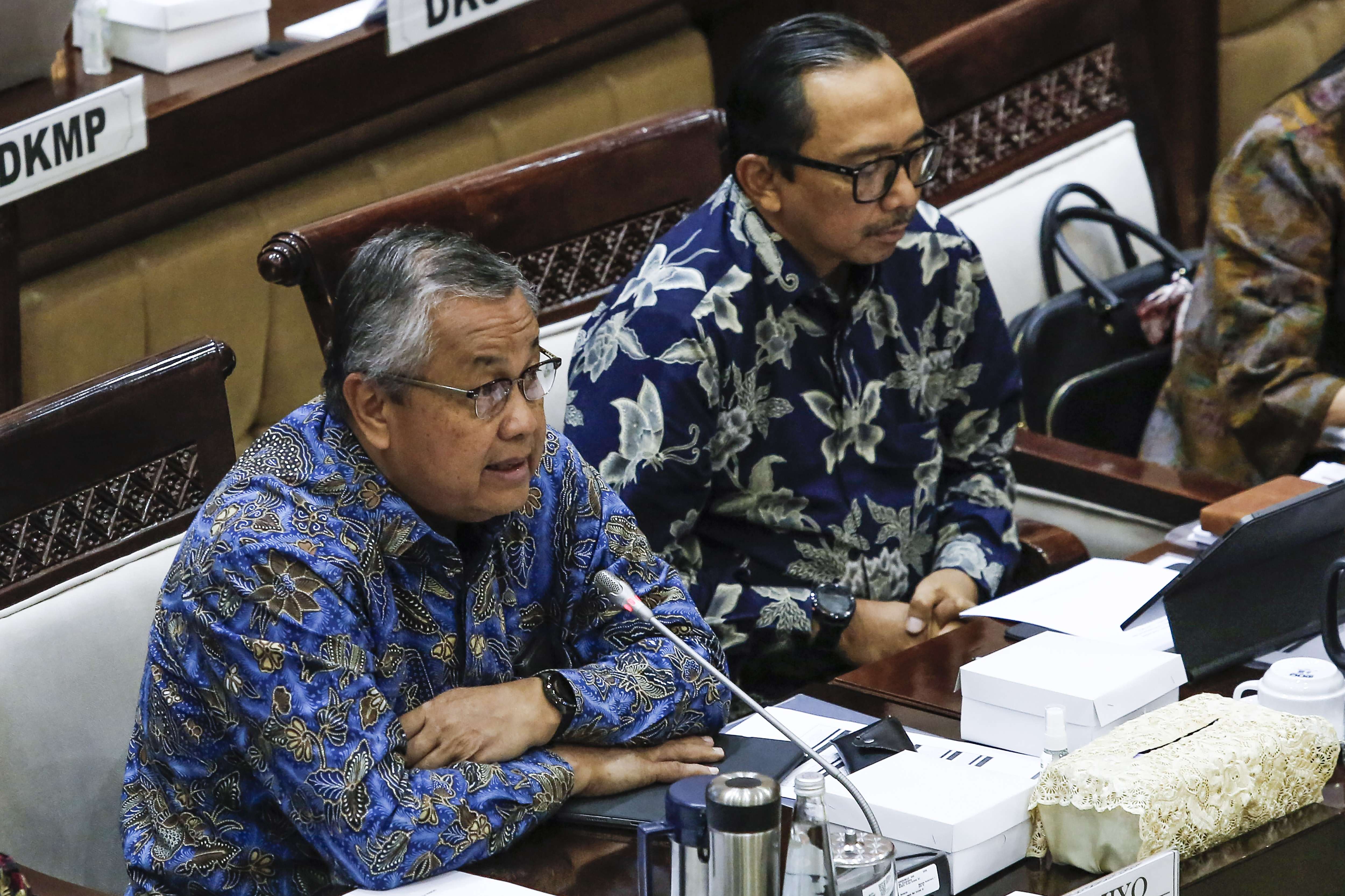 印尼央行行长贝利·瓦尔吉约(左)与副行长朱达·阿贡(右)于2025年11月13日(周四)在雅加达塞纳延国会大厦出席与印尼国会第十一委员会的工作会议时发表意见。