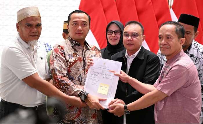 2025年11月13日,在雅加达哈林空军基地的VVIP休息室里,来自马桑巴第一国立高中的两位教师阿卜杜勒·穆伊斯和拉斯纳尔,与国务秘书普拉塞蒂奥·哈迪(左二)及国会副议长苏夫米·达斯科·艾哈迈德共同展示了普拉博沃总统授予阿卜杜勒和拉斯纳尔的复权信函。