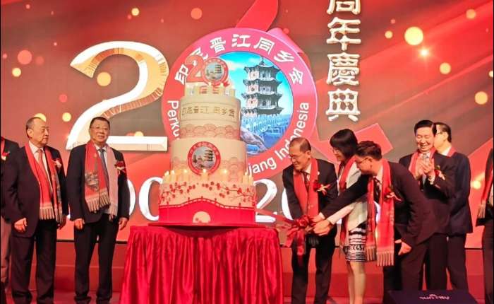 立20周年表示热烈祝贺。他表示,印尼晋江同乡会二十年来团结乡亲、服务社群、情系桑梓,已成为海外晋江人携手共进的典范。他回顾第十四届世晋总理事会在全球乡亲支持下推进改革、加强联络、设立秘书处等成果,并对晋江市委市政府及各社团的长期支持表示感谢。