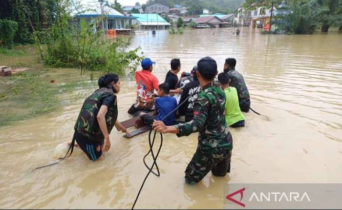 印尼边境安全部队与Sanggau地区灾害管理局及当地警方联合疏散西加里曼丹-马来西 亚边境受洪灾影响的居民。