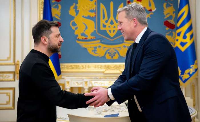 11月20日,美国陆军部长德里斯科尔(右)在基辅会见乌克兰总统泽连斯基(左)。(路透社)