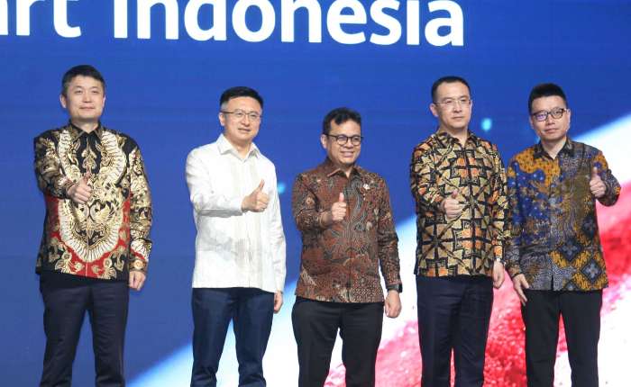 (左起):华为云市场部总裁董理斌,华为印尼董事长辛大江,印尼通信和数字化副部长Nezar Patria,华为云亚太区总裁尚海峰,华为云印尼首席执行官方磊在雅加达举行的 “Huawei Cloud Indonesia Summit 2025” 活动现场合影。(印尼商报 / Hermawan摄)