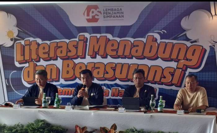 图为:存款担保机构(LPS)保单担保项目委员 Ferdinan D. Purba、理赔与银行处置执行主任 Dimas Yuliharto,以及保险监管、数据与检查执行主任 Suwandi,于2025年12月7日(周日)在西爪哇省万隆县举办的“储蓄与保险知识普及”活动期间同台出席。