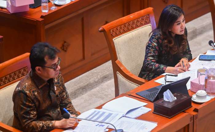 2025年12月8日,印尼通信与数字部长梅蒂亚(右)与副部长内扎尔(左)在雅加达国会大厦与第一委员会举行工作会议,听取各党派系意见。此次会议重点讨论了协作性战略政策,旨在预防因信息失控可能引发的社会动荡风险。