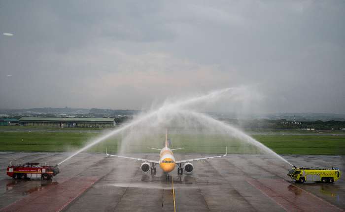 周二(2025年12月23日),在中爪哇省三宝垄的艾哈迈德.亚尼(Ahmad Yani)机场,酷航(Scoot)一架空客A320 neo型飞机在执行三宝垄至新加坡航线首航时,受到了水门仪式的欢迎。