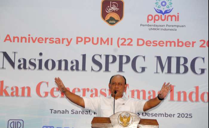 周二(2025年12月23日),在西爪哇省茂物市Tanah Sareal镇Mekarwangi村,国家营养局局长Dadan Hindayana在综合营养服务单位暨2045年黄金印尼一代运动启动仪式上致辞。
