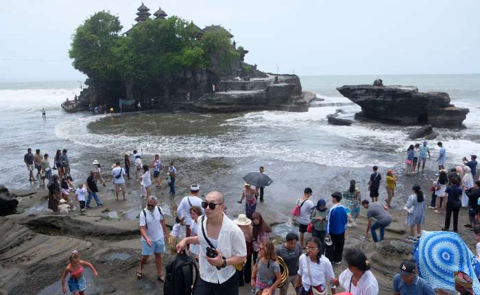 周二(12月30日),游客在巴厘塔巴南(Tabanan)县海神庙(塔纳洛特/Tanah Lot)旅游景点享受年末假期海滩风光。