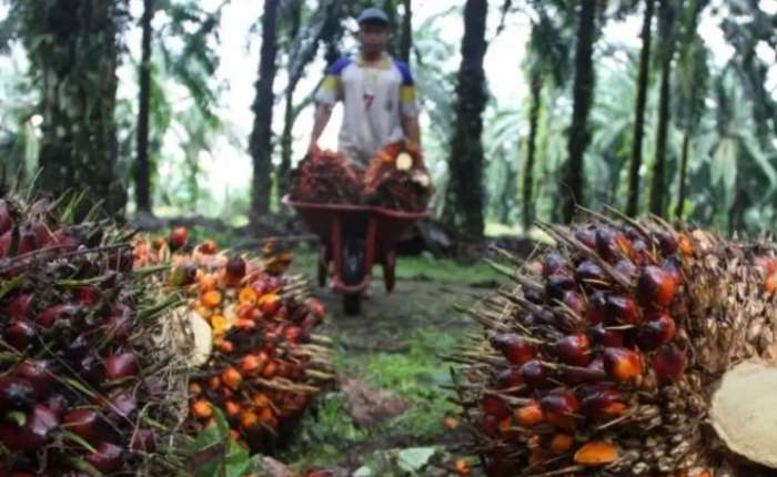 东加省东库台县,油棕种植户在油棕榈园内开展采收作业。