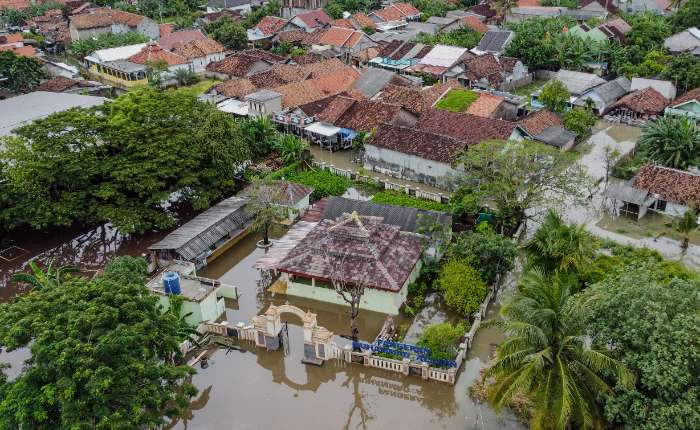 图为周六(2026年1月3日)在万丹省西冷(Serang)市卡塞门(Kasemen)镇区被洪水淹没的居民区航拍照片。