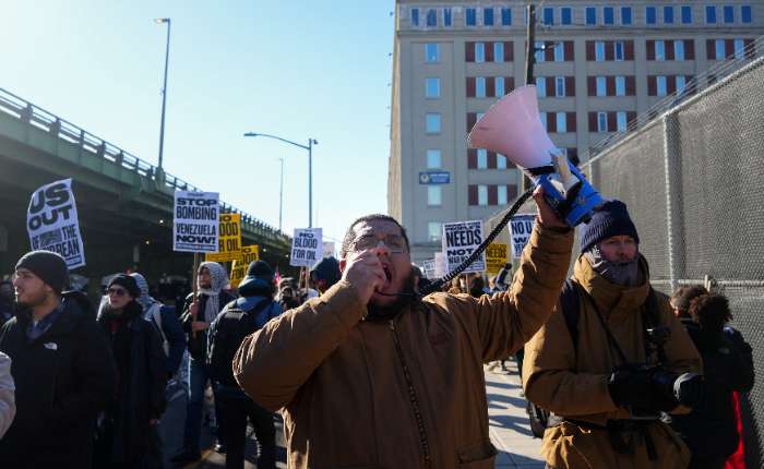 当天,在位于纽约布鲁克林区的拘押委内瑞拉总统马杜罗的大都会拘留中心外围,大批民众高举“勿对委内瑞拉开战”“停止轰炸委内瑞拉”等标语,反对美国袭击委内瑞拉。