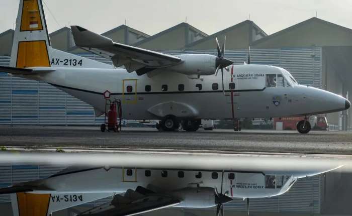 印尼航天公司工作人员在西爪哇省万隆市PTDI交付中心机库,对一架NC212i飞机进行交付前进行检查。