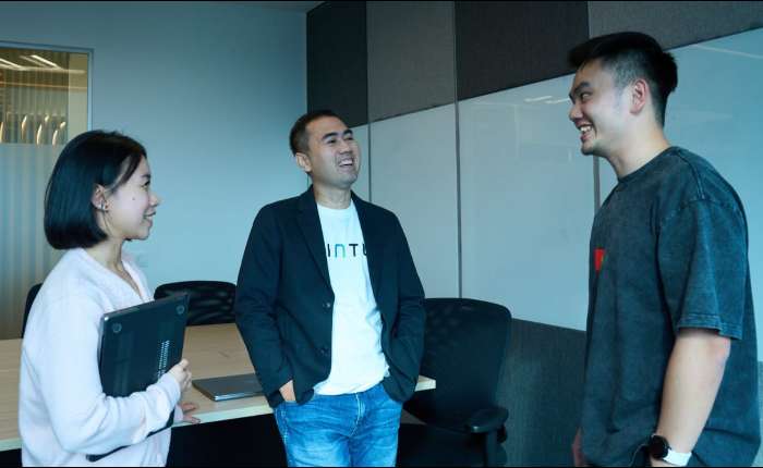 1月19日(周一),在雅加达,PINTU 产品营销负责人 Iskandar Mohammad(中)在完成相关说明后,与团队成员进行交流。(商报/Hermawan摄)