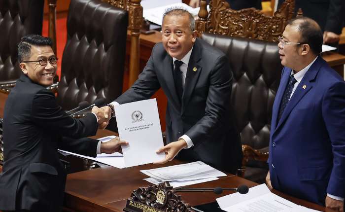 印尼国会全体会议通过决议,批准托马斯·吉万多诺担任2026-2031年届印尼央行副行长,接替辞去职务的朱达·阿贡。托马斯出席全体会议并向全体国会议员亮相,随后与两位国会副议长合影。
