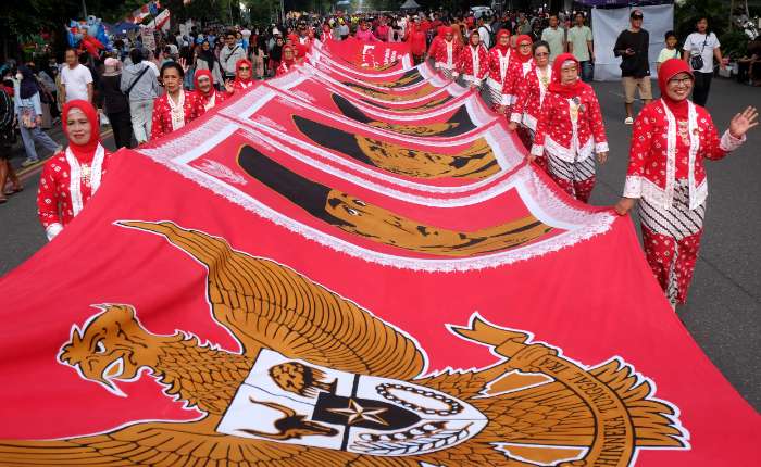 周日(2月1日),在中爪哇省梭罗市Slamet Riyadi街举行的游行中,德博爱可芭雅社区(Komunitas Cinta Kebaya Depok)成员展开了一块长达17米、印有印尼总统肖像图案的手绘蜡染布。该活动为宣传保护蜡染布和可芭雅服饰,并表达对印尼历任总统贡献的赞赏。