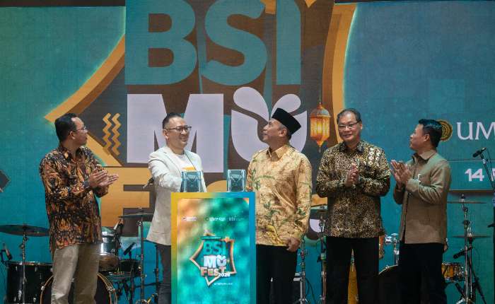印尼夏利亚银行(PT Bank Syariah Indonesia(Persero)Tbk,BSI)合规与人力资本总监 Arief Adhi Sanjaya(左二)与 Muhammadiyah 中央理事会组织、意识形态、干部化及青年发展事务主席 Agung Danarto(中)、Muhammadiyah 日若大学校长 Achmad Nurmandi(右二)、数字银行业务高级执行副总裁 M. Misbahul Munir(右)以及中央理事会研究与发展理事会第三副秘书 Adam Jerussalem(左),共同为在 UMY 校园举行的 BSI Muhammadiyah Festival(MU-FEST) 揭幕。活动于 2月14日(周六) 在日惹特区班图尔举行。该活动由BSI与UMY 联合举办,内容涵盖启发性讨论、时装展示、对话论坛及清真产品市集,旨在推动金融素养、提升伊斯兰银行业普惠水平,并培育现代化、具竞争力的新一代。