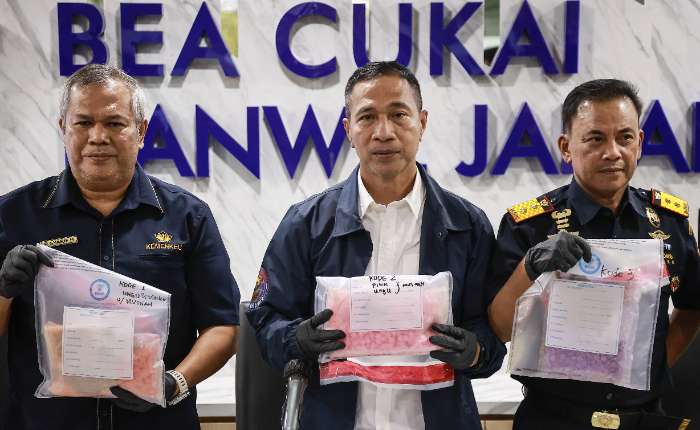 印尼国家禁毒局(BNN)根除事务代理副局长罗伊.哈尔迪.西哈汉(Roy Hardi Siahaan,中)准将,在海关总署雅加达办事处主任亨德里.达尔纳迪(Hendri Darnadi,右)及毒品拦截局局长夏里夫.希达亚特(R. Syarif Hidayat,左)陪同下,于周三(2月25日)在雅加达举行的新闻发布会上展示海关与禁毒局联合破获的毒品证物。海关总署与国家禁毒局近日在西爪哇省勿加西县芝卡朗镇Cibatu村成功抓获一名姓名缩写为AZ的男性嫌疑人,缴获第一类毒品MDMA(摇头丸)共计4080粒,总重1907.2克。此次行动预计为国家节省约65亿盾的社会成本支出。
