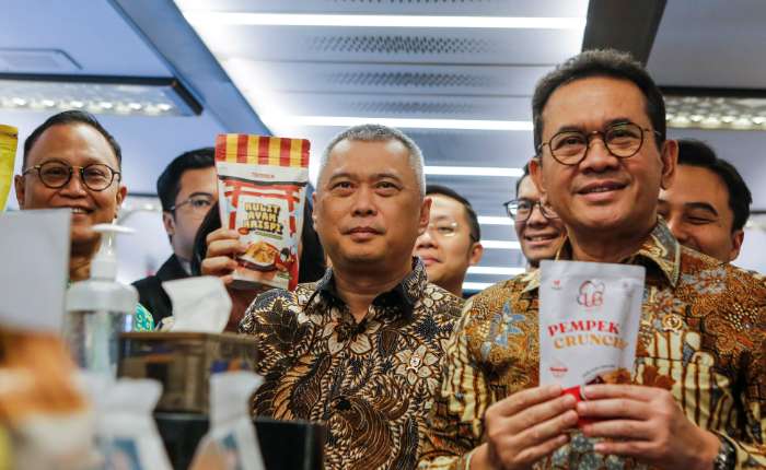 2026年2月24日,印尼贸易部长布迪·桑托索(右)与交通部长杜迪·普尔瓦甘迪(右二)在雅加达甘比尔站的阿尔戈·辛多罗号列车餐车车厢内展示本地中小微企业产品