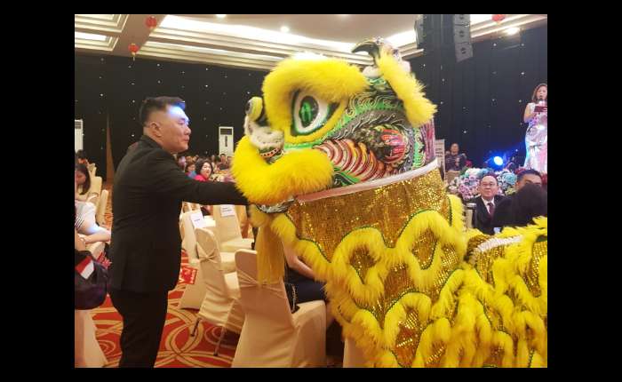 庆典伊始,同乡会主席郑臣顺(Irianto)率核心理事登台向乡亲拜年,筹委会成员在台下呼应互动,并齐唱《恭喜恭喜》。随后,醒狮献瑞拉开序幕,现场高悬“新年快乐·恭喜发财”贺幅,洋溢浓厚节日气氛。