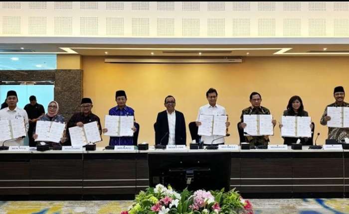 (图左至右)印尼国家人口与计划生育局局长Wihaji、妇女赋权与儿童保护部部长Arifah Fauzi、中小学教育部长Abdul Mu’ti、宗教部部长Nasaruddin Umar、人类发展与文化统筹部长Pratikno、卫生部长Budi Gunadi Sadikin、通讯与数字事务部长Meutya Hafid以及社会部长Saifullah Yusuf在雅加达共同签署了关于儿童心理健康的联合决定书。